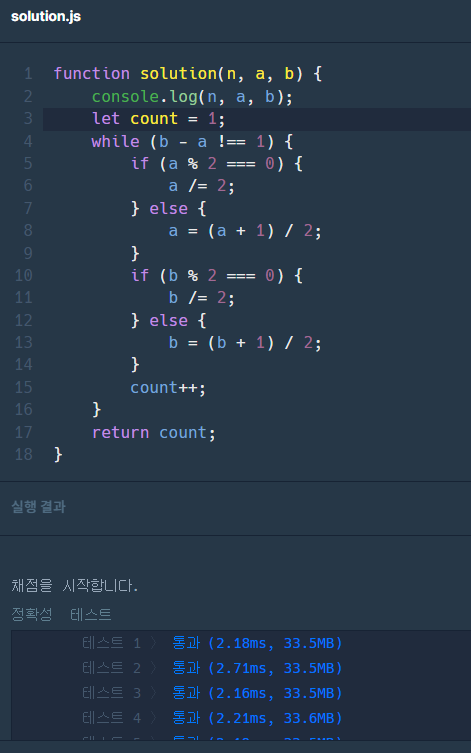 a, b 가 짝수면 반을 나눠주고 홀수면 1을 더한 후 나눠주는 식으로 했는데도